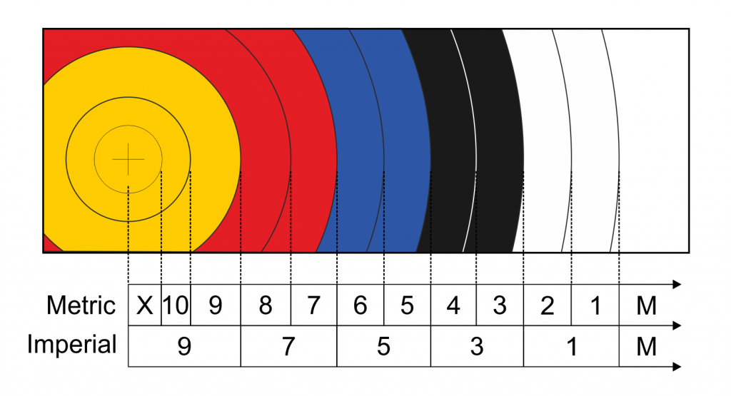 Metric rounds are those internationally recognized by World Archery (previously FITA), and are shot at distances measured in metres. Like indoor rounds, they use “10-zone” scoring, where each colour is divided into an inner and an outer zone (for example, inner blue is 6, while outer blue is 5). Again, misses are “M”s.